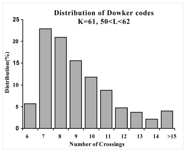 - \(100,000\) diagrams sampled for each knot type (approx. \(1,500\) samples per diagram size)